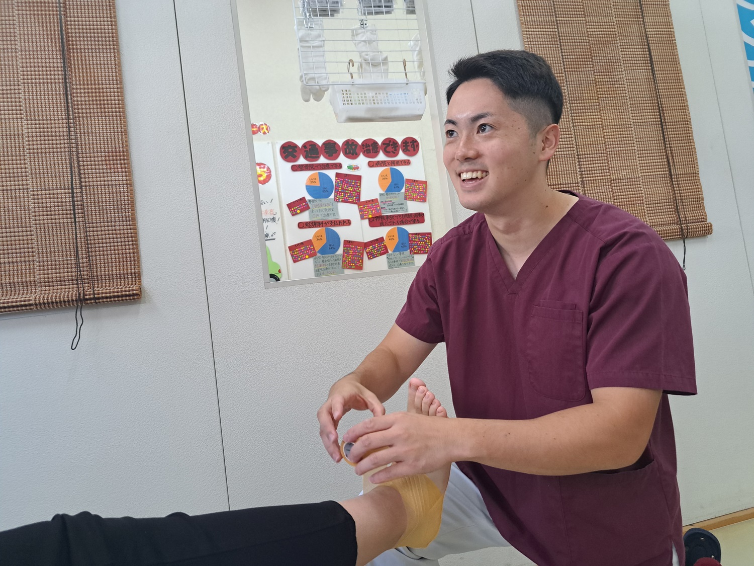 平日は整骨院で患者様の施術や事務作業などが中心で、土日はサッカーチームの試合に帯同し、スポーツトレーナーとして怪我の対応やテーピングなどのサポートを行なっています。